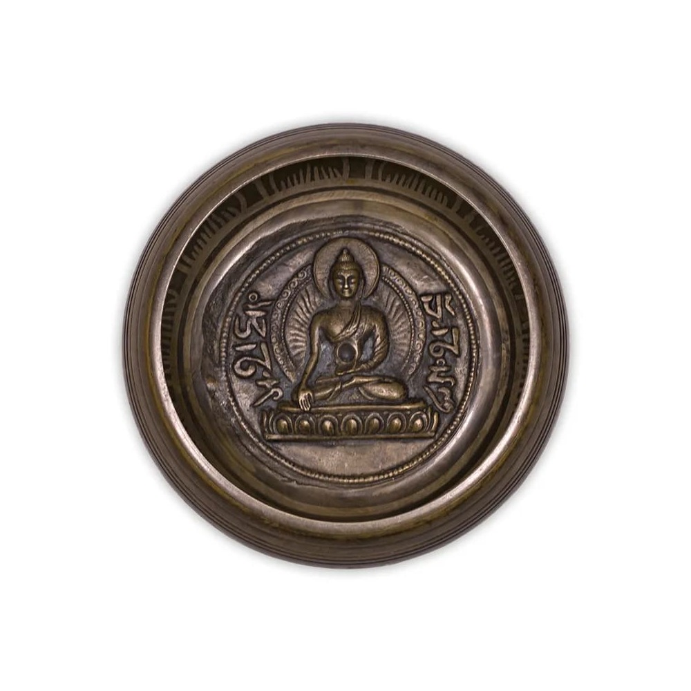 Klangskål med relief av Shakyamuni Buddha. Graverad på både insidan och utsidan, med Om Mani Padme Hum-mantrat.