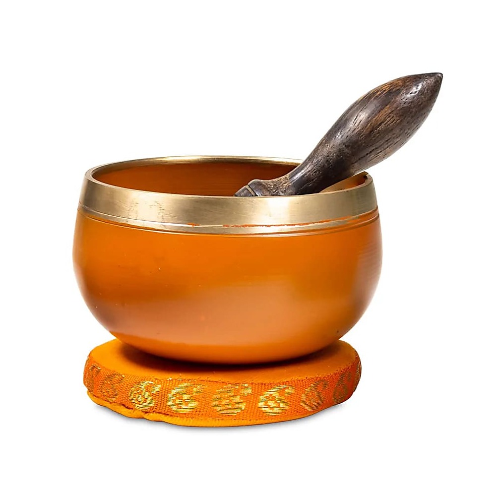 Klangskål med chakrafärg och symbol. Ej stämd enligt chakraton (endast möjligt om kristall).