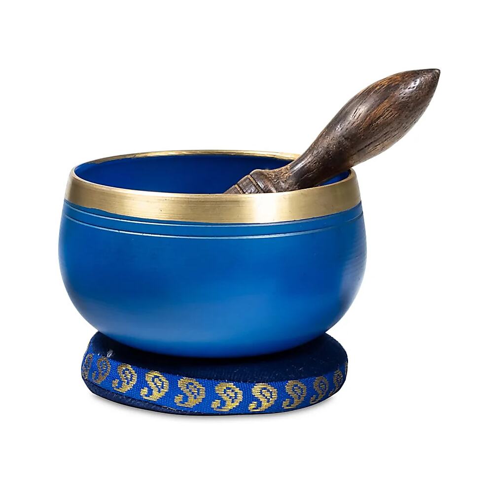 Klangskål med chakrafärg och symbol. Ej stämd enligt chakraton (endast möjligt om kristall).