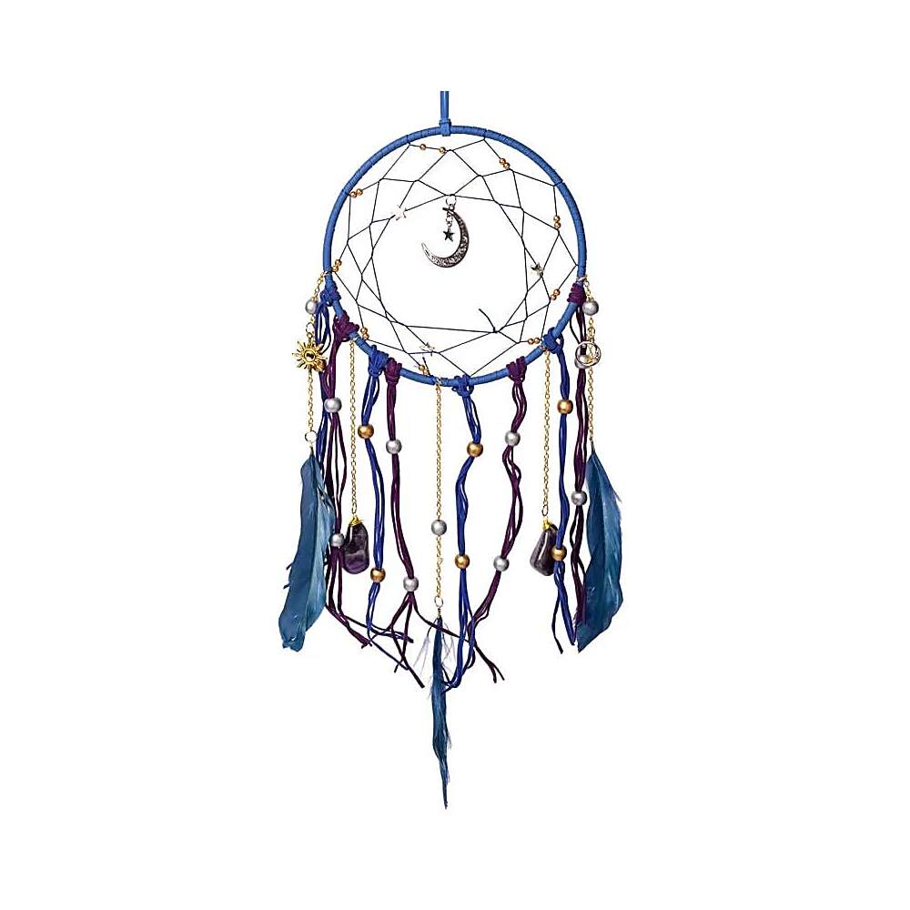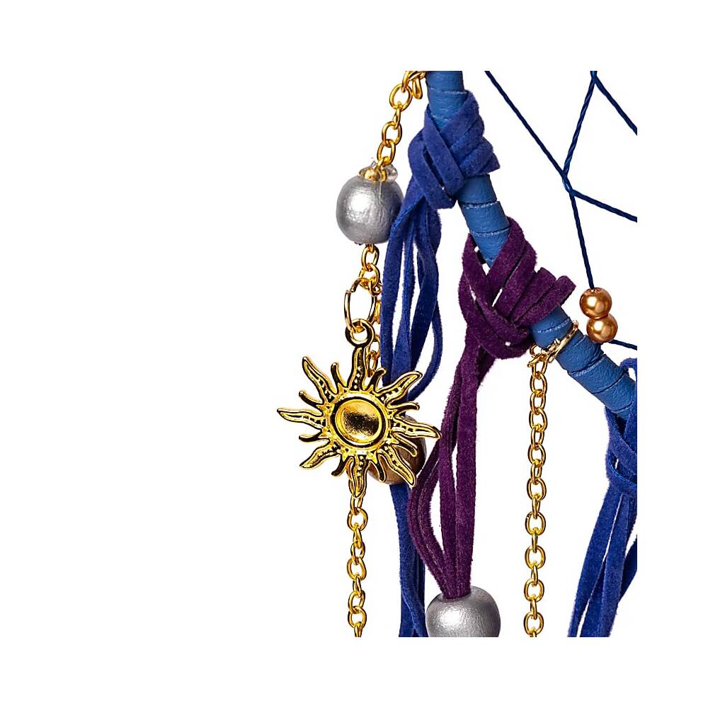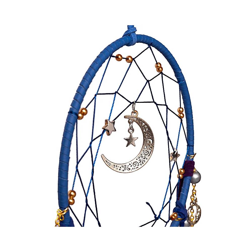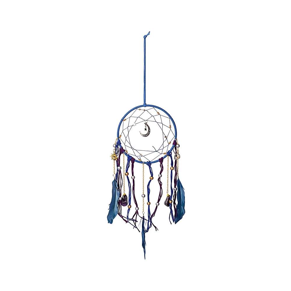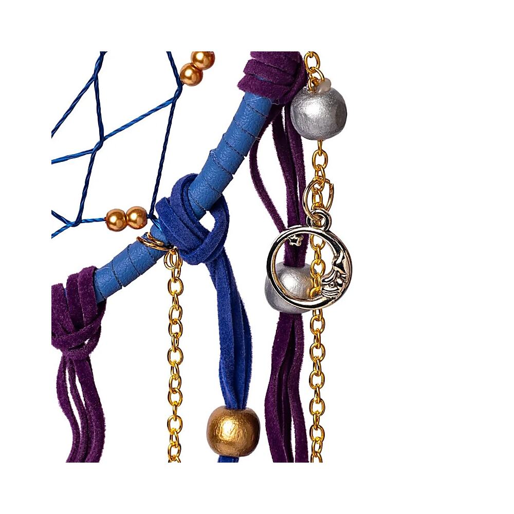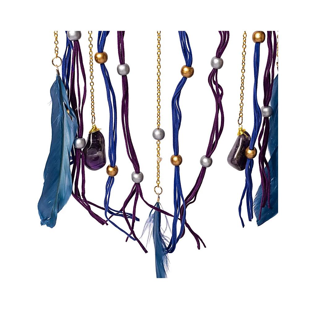 Denna drömfångare kombinerar dekorativa element som sol- och månberlocker, trumlade ametiststenar och skimrande guldfärgade kedjor. Månskäran i mitten, i kombination med blå och lila toner, ger drömfångare ett magiskt utseende.