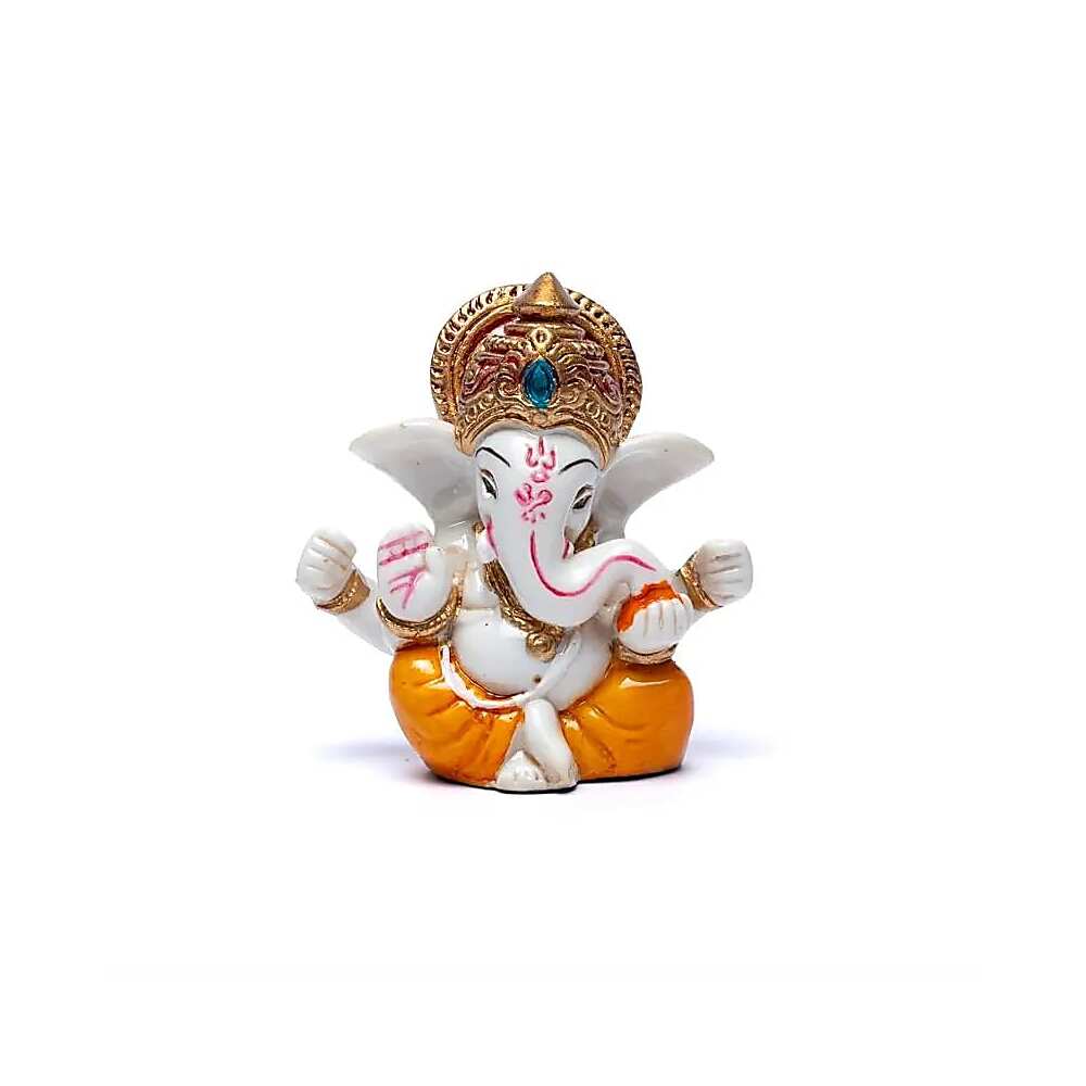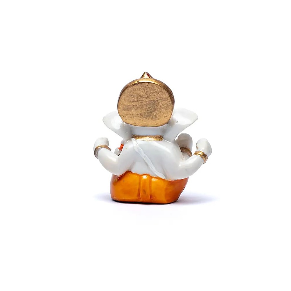 En detaljerad figurin av Ganesh gjord av harts. Den nedre högra handen är i abhaya mudra, en gest av skydd och avlägsnande av rädsla, medan den nedre vänstra armen håller en modaka – en traditionell söt dessert – som symboliserar belöningarna för ett disciplinerat och hängivet liv.