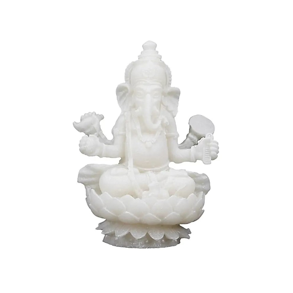 Statyett av den välkände indiska lyckobringande elefantguden Ganesh, med fyra armar sittande på en lotustron. Vackra detaljer.