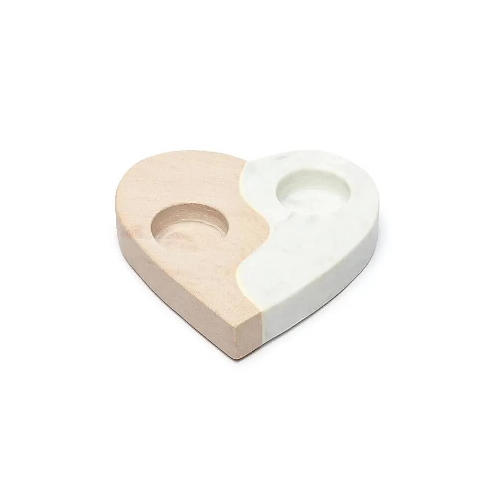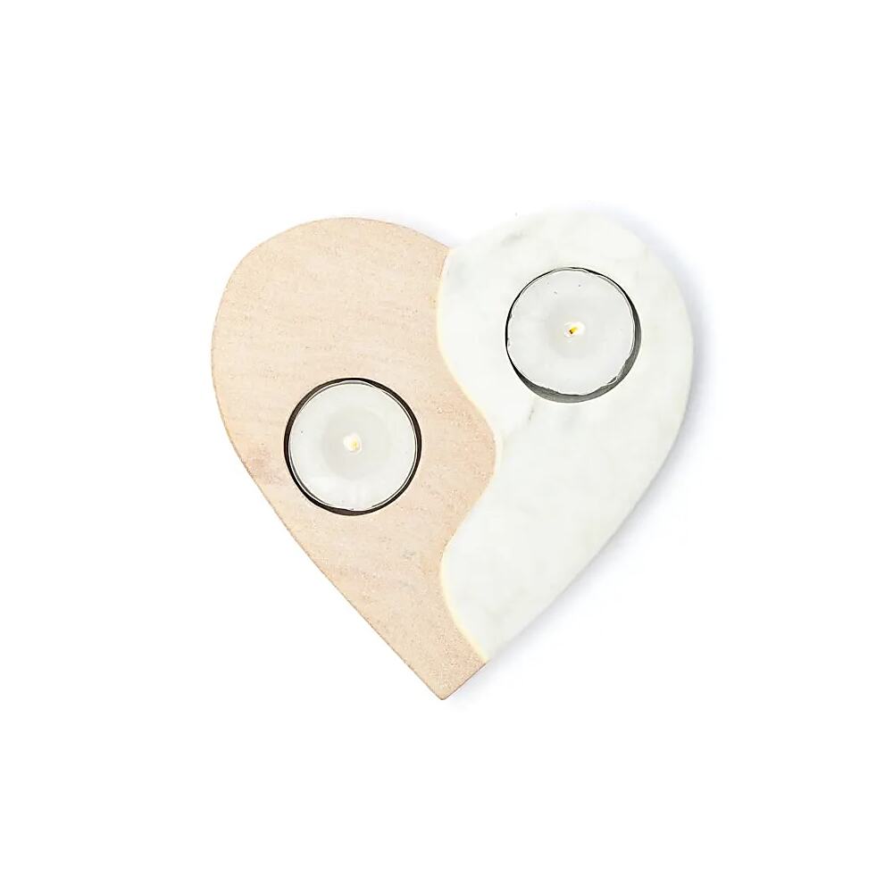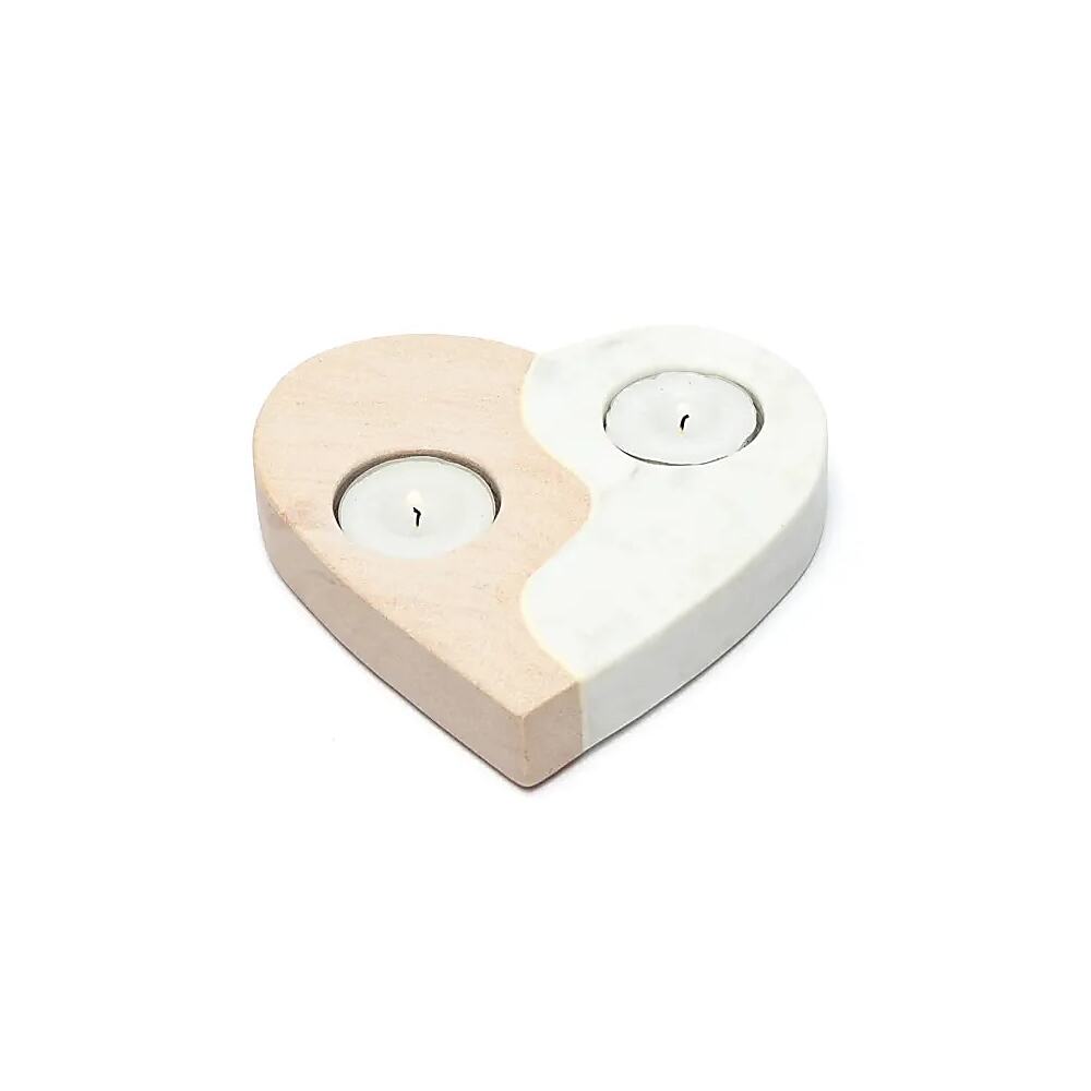 Denna unika ljusstake kombinerar den naturliga skönheten hos rosa sandsten och marmor i en hjärtform. Perfekt för att skapa en mysig atmosfär, oavsett om den placeras på ett bord, en hylla eller fönsterbräda. Materialkombinationen ger den ett elegant och lyxigt utseende som förhöjer vilket utrymme som helst.