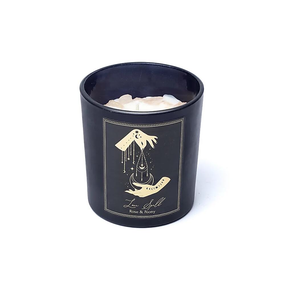 Glänsande manifestationsljus i glas, handgjutet av giftfri soja och palmvax. Med eteriska oljor och ädelstenar. När ljuset brinner sjunker ädelstenarna samman med vaxet. När ljuset är slut kan du spara ädelstenarna.