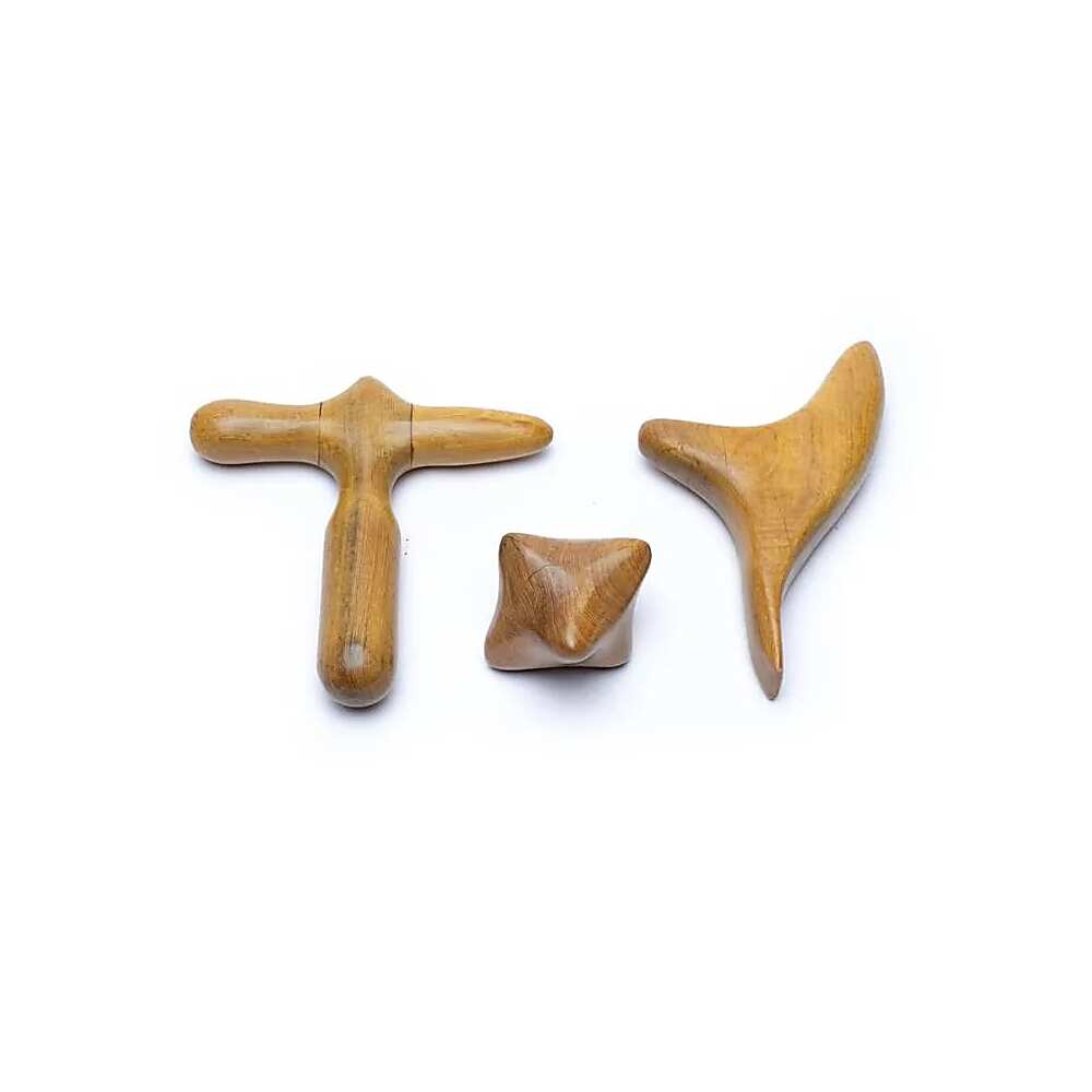 Massageset bestående av 3 manuella massageverktyg tillverkade av sandelträ.