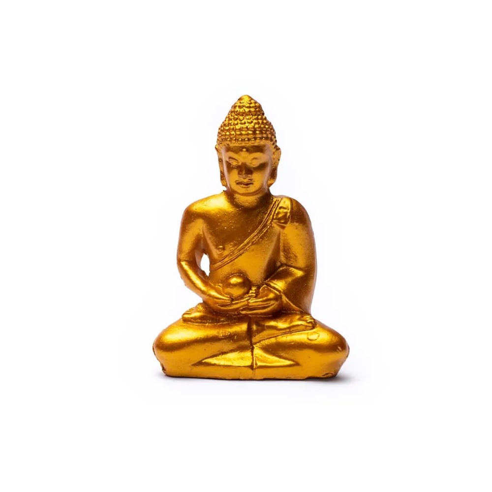 Originell liten presentpåse med en liten guldfärgad Buddha-statyett inuti.