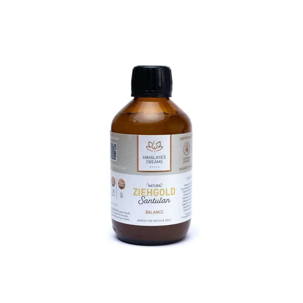 Himalaya’s Dreams Organic Ayurvedic Ziehgold Santulan oljedragning tillverkas i Indien och följer noggrant traditionella recept och produktionsmetoder från Ayurveda.