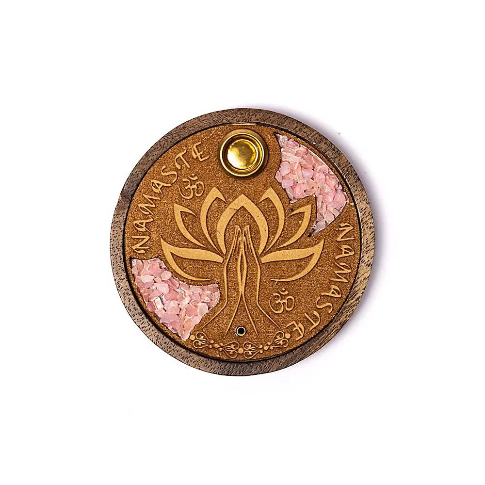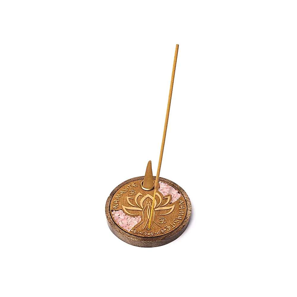 Hållare för pinnar och koner med Namaste-dekoration, berikad med rosenkvarts ädelstensflisor.