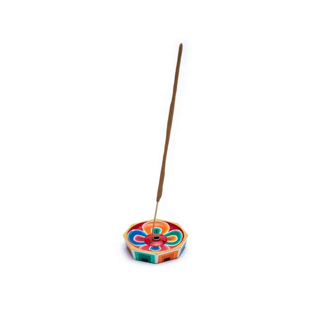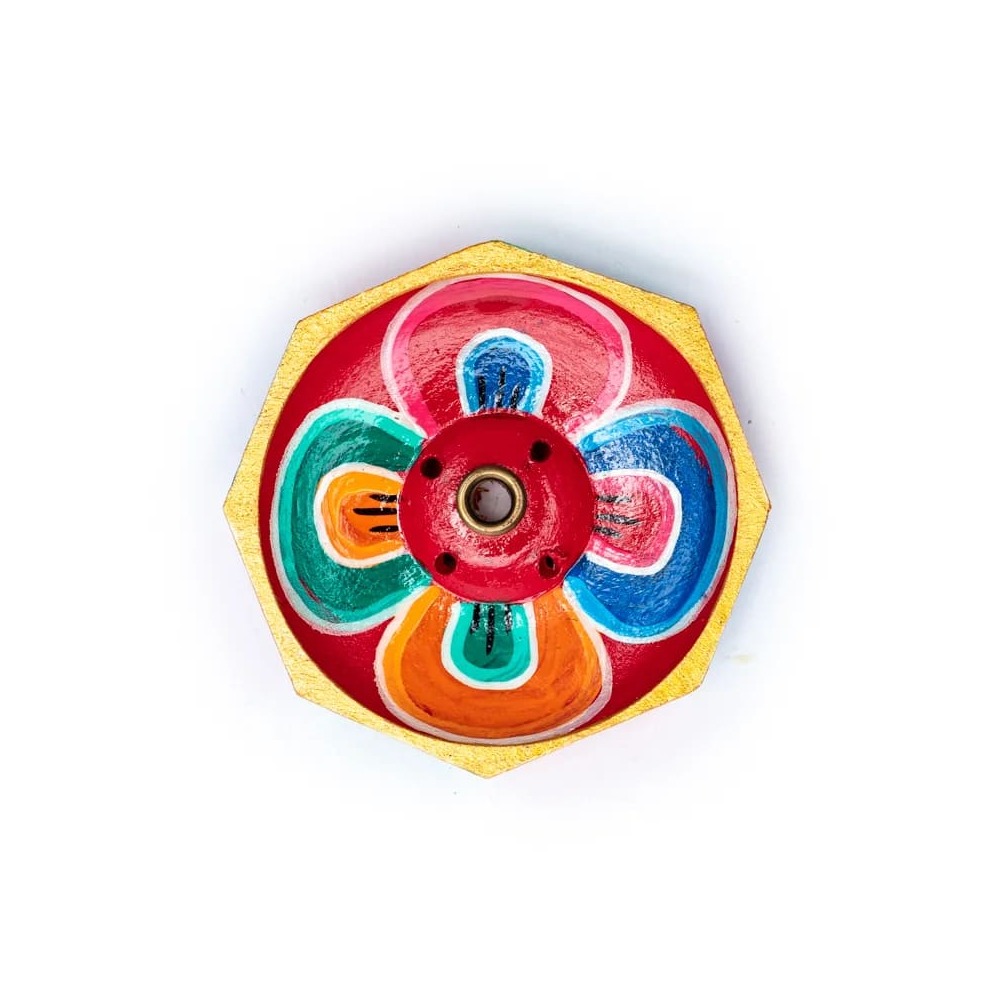 Rökelsehållare – Lotusblomsdesign – färgglatt lackerat trä. Handgjord i Nepal. För säker bränning av rökelsepinnar.