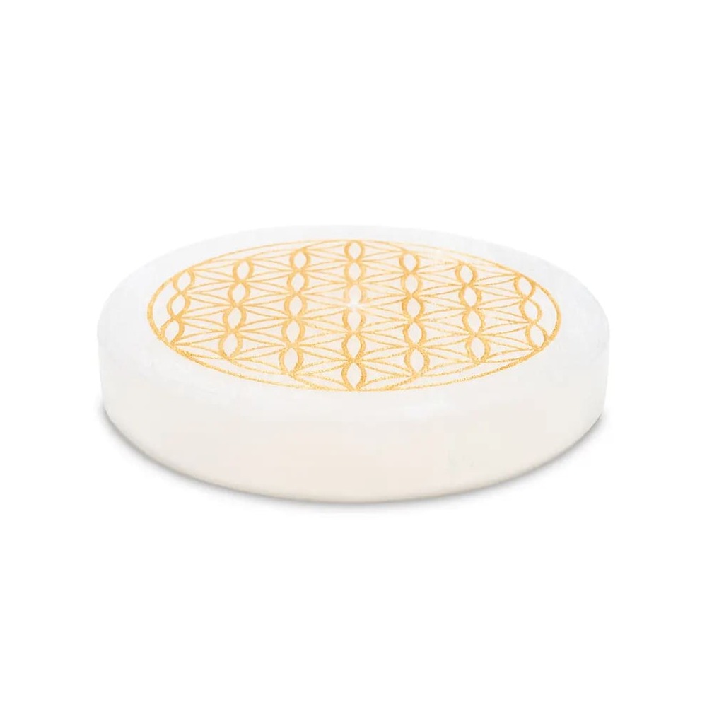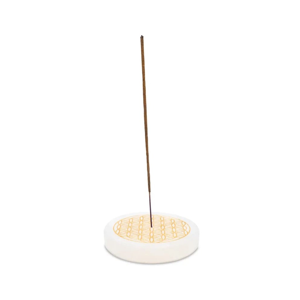 Rökelsehållare i selenit (satin spar) med graverad symbol för livets blomma i guldfärg.