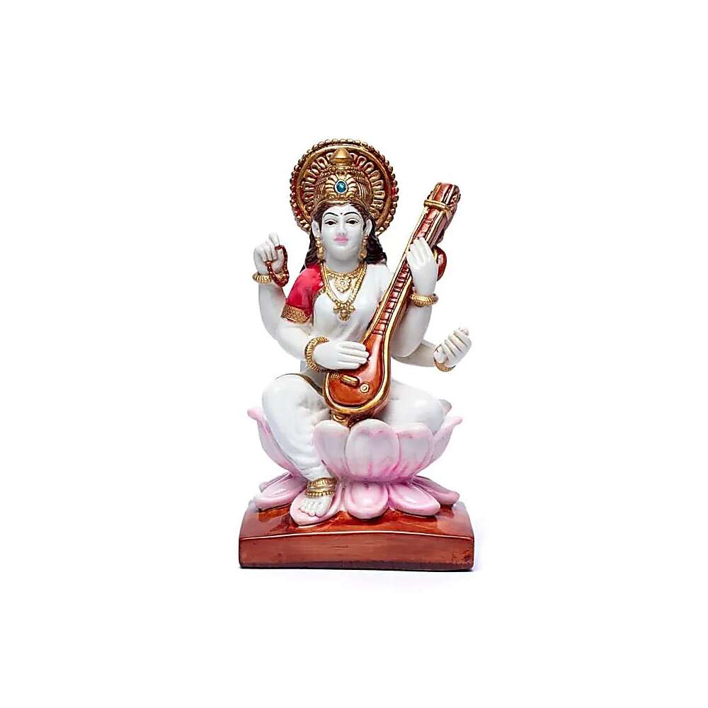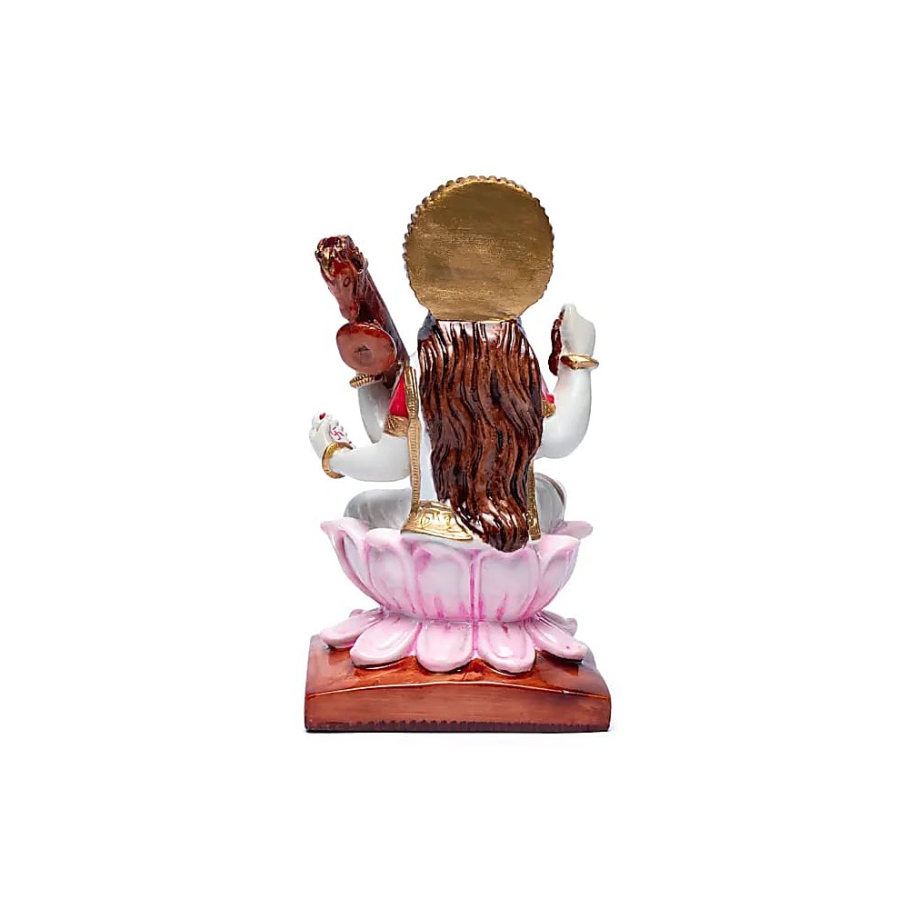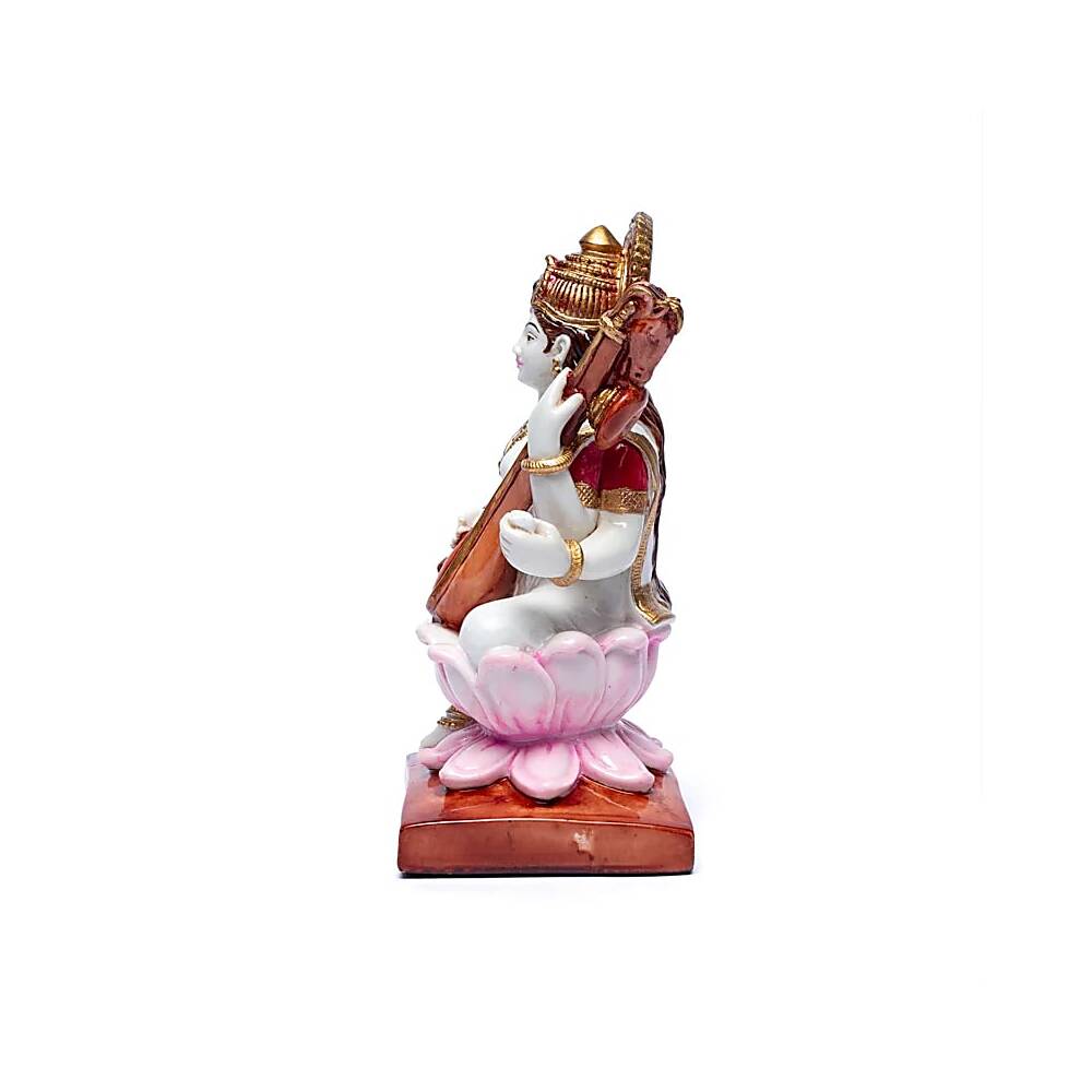 Statyett av harts – Saraswati, musikens, poesins, retorikens och vetenskapernas gudinna. Hon avbildas vanligtvis hållande en vina, ett stränginstrument som liknar en sitar. I strängarna uppstår vibrationerna från hela skapelsen, vilka expanderar runt henne likt vågor. Eftersom sanskritspråket också består av dessa vibrationer, bär hon ett palmbladsmanuskript som en representation av Vedaböckerna – en av de äldsta texterna som någonsin skrivits.