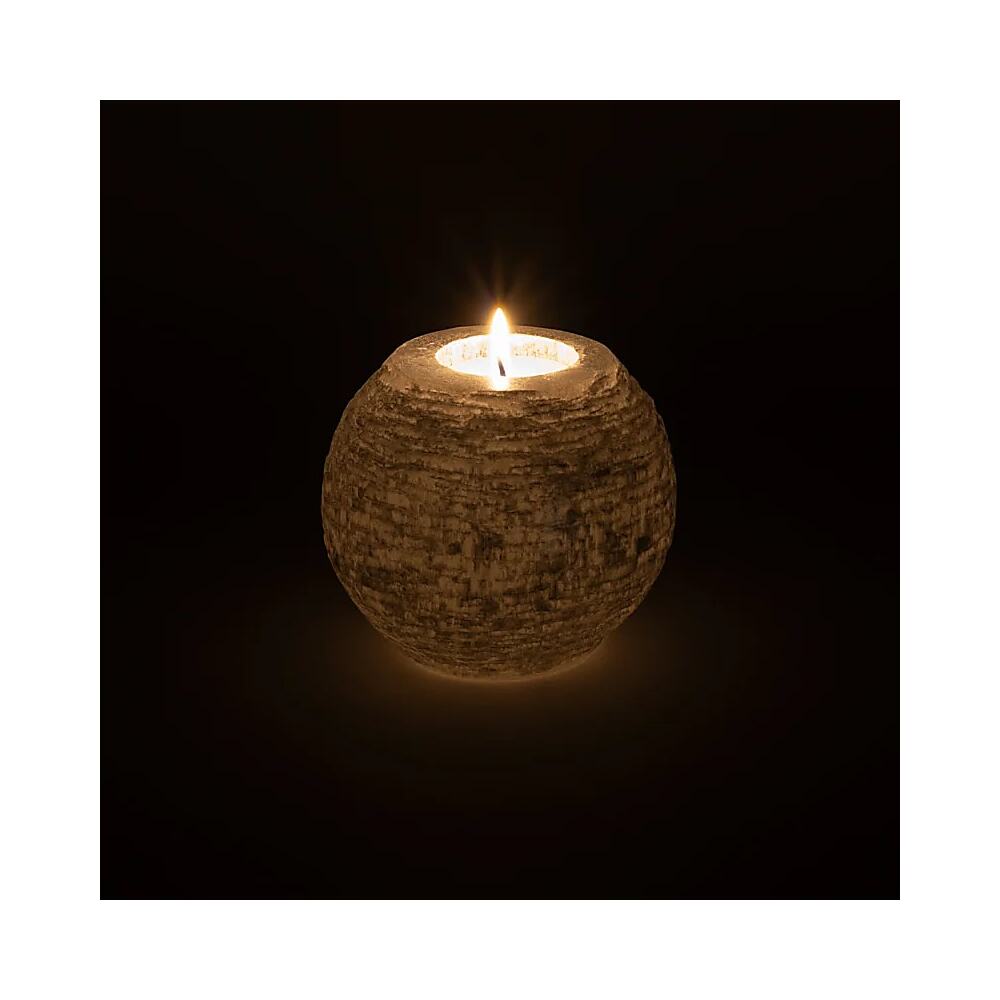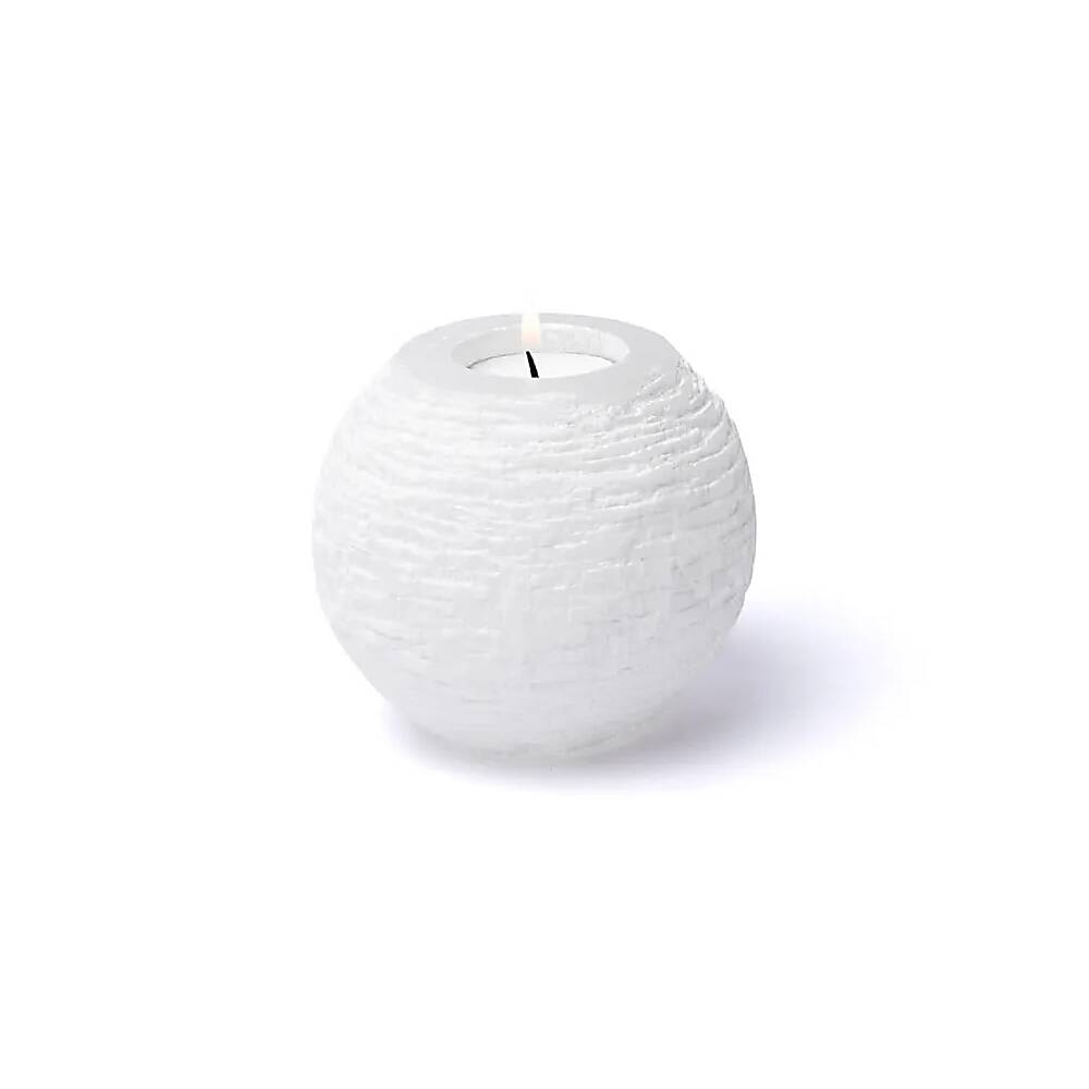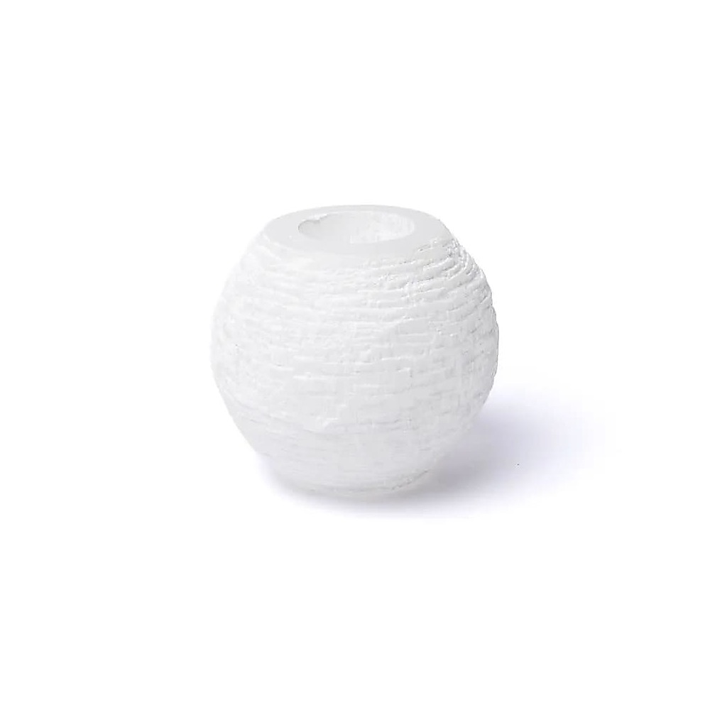 En större, rund värmeljushållare av selenit som ger mjukt, stämningsfullt ljus.