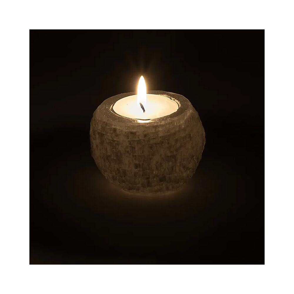 En liten, rund värmeljushållare av selenit som ger mjukt, stämningsfullt ljus.
