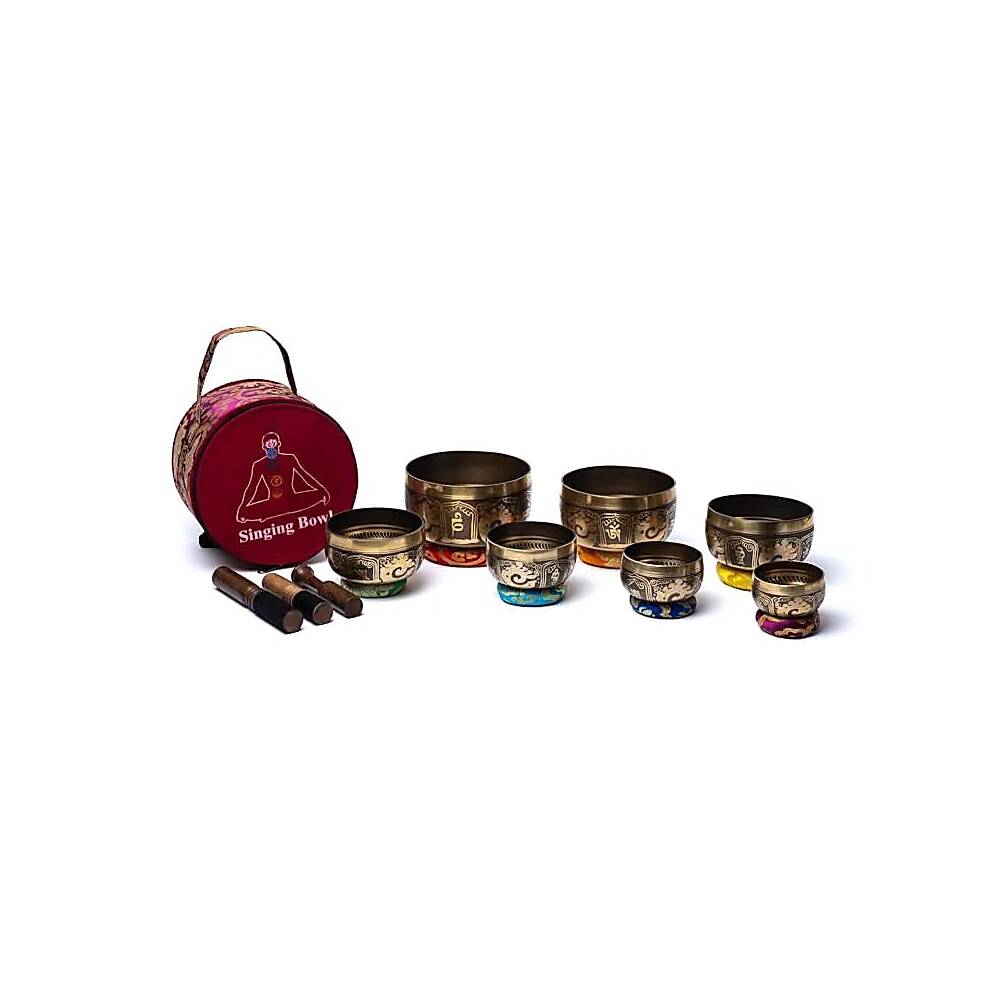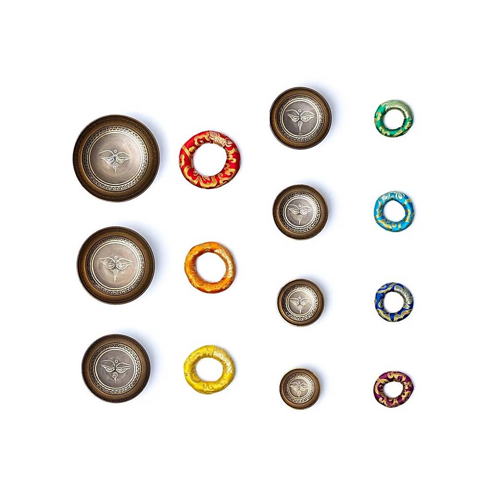 Set med 7 dekorativa klangskålar, tillverkade av koppar, zink, tenn och 8 ädelmetaller (Ag, Ni, Cd, Ru, Pd, Pt, Cr, Mn), var och en rikt utsmyckad och med det som kallas Buddhas ögon eller ”visdomsögon”. Sjungskålarna är utformade för att vara stapelbara, så de får enkelt plats i den praktiska bärväskan tillsammans med de medföljande tillbehören.
