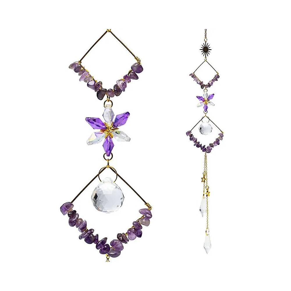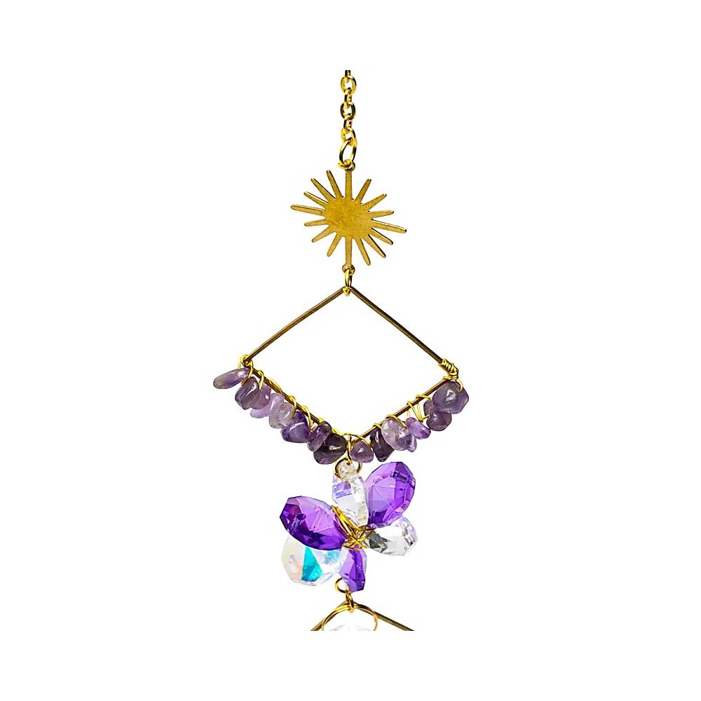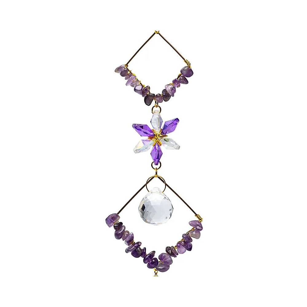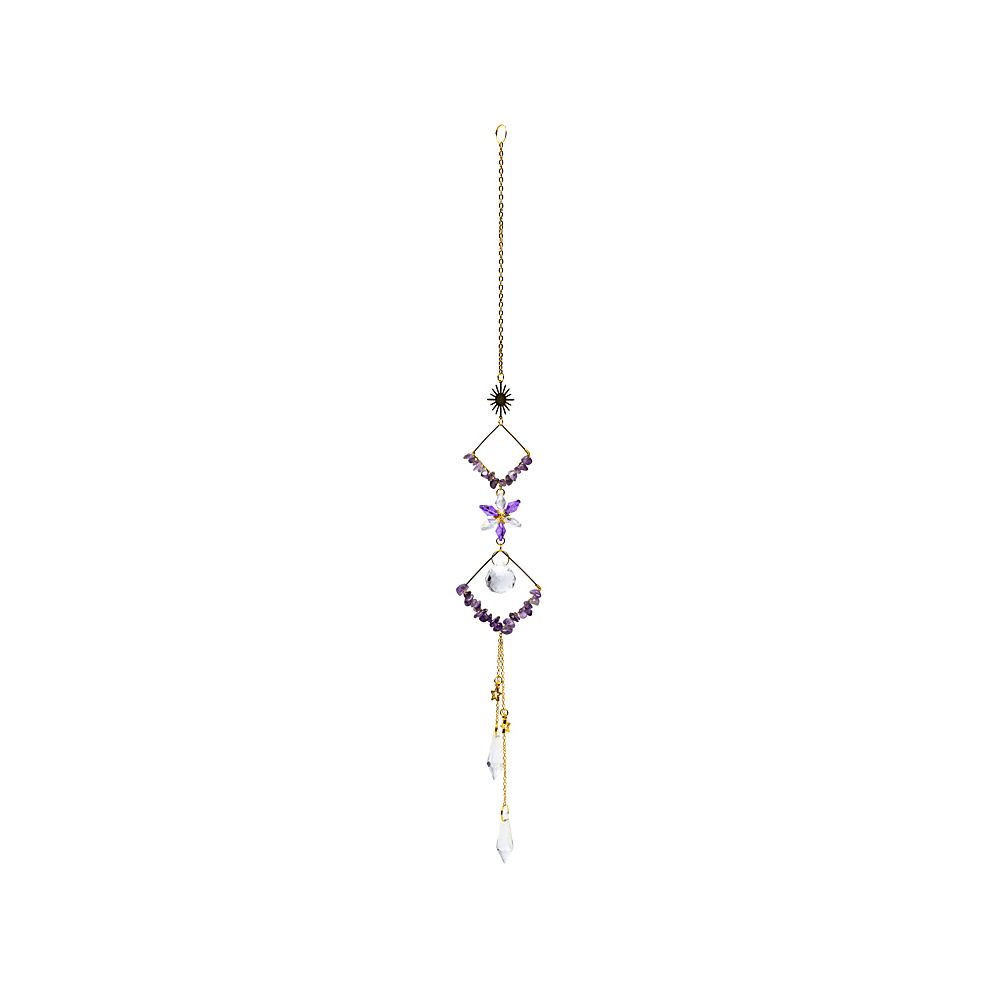 Denna eleganta solfångare kombinerar ametiststenar med invecklade rombformer. När solljuset träffar kristallerna skapar det vackra ljusmönster som väcker liv i vilket rum som helst. Häng den i ett soligt fönster eller bland växter för en unik dekorativ detalj. Ett härligt sätt att ge färg och harmoni till ditt hem, eller som en omtänksam present till någon speciell.