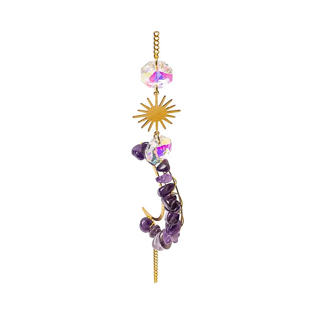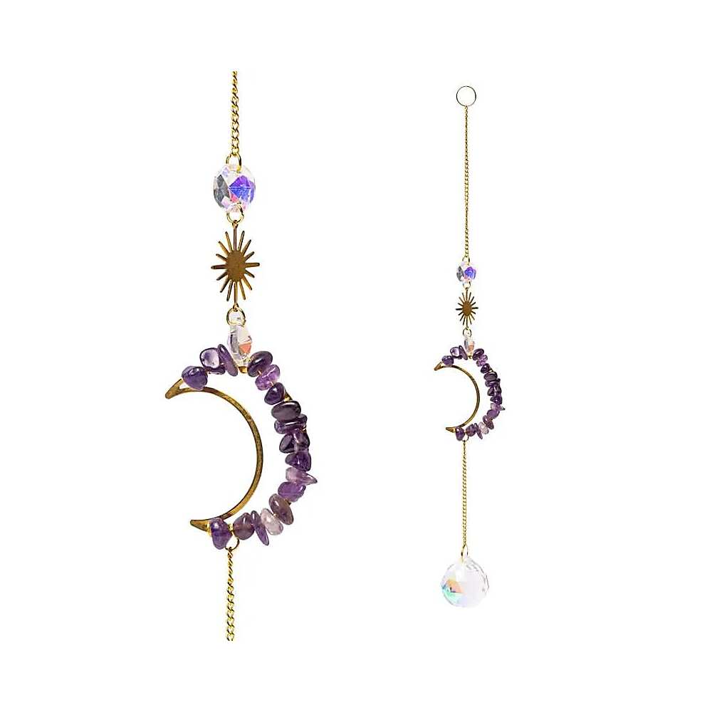 Lägg till en himmelsk accent i din inredning med denna månformade solfångare, dekorerad med ametist och en glittrande kristallkula. Oavsett om du hänger den framför ett fönster eller ovanför ett säsongsbetonat bord, ger denna solfångare ljus och värme var du än placerar den.