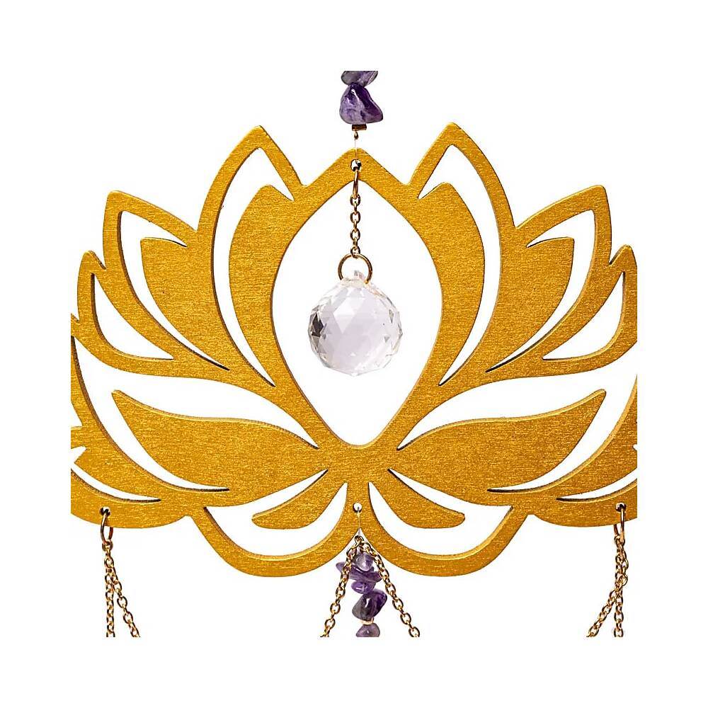 Lägg till en himmelsk accent i din inredning med denna lotussolfångare, dekorerad med ametist och glittrande kristallkulor. Oavsett om du hänger den framför ett fönster eller ovanför ett säsongsbetonat bord, ger denna solfångare ljus och värme var du än placerar den.