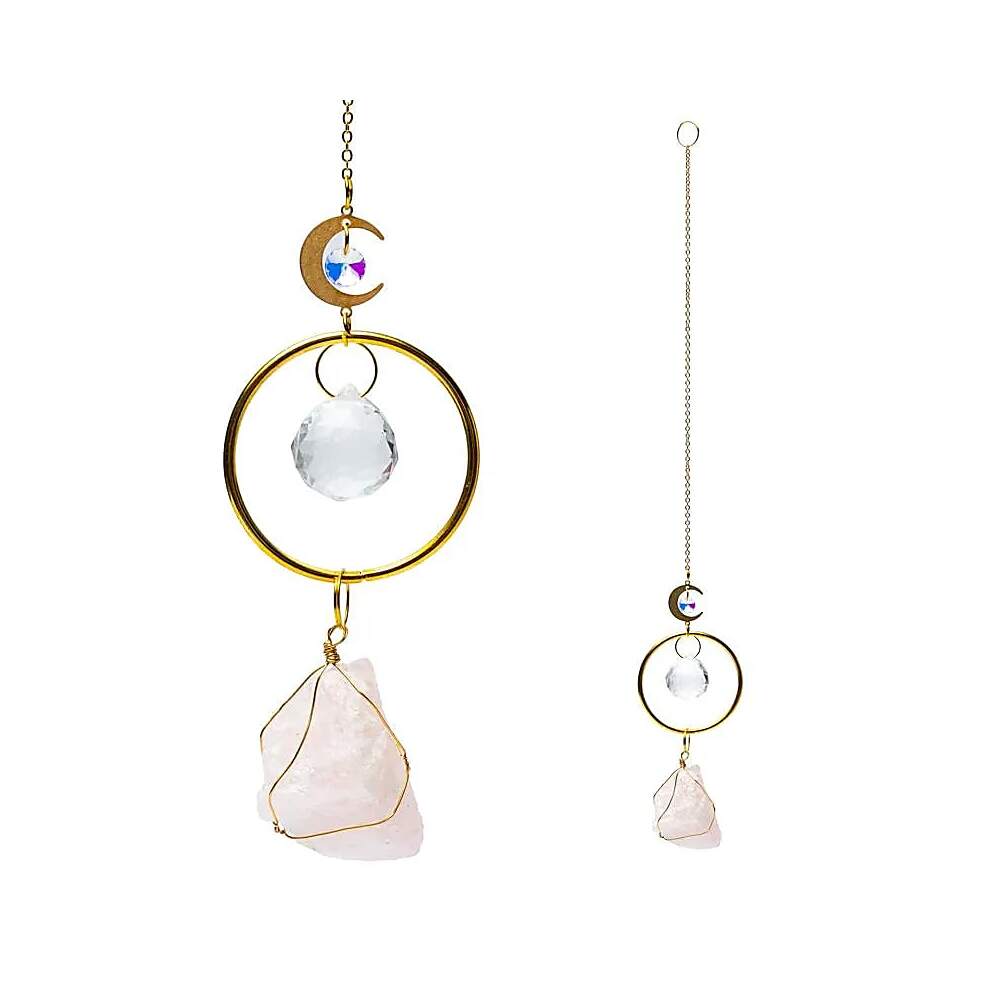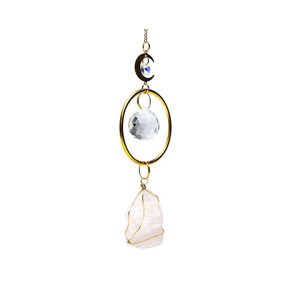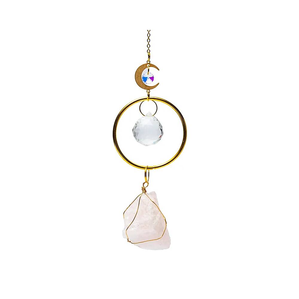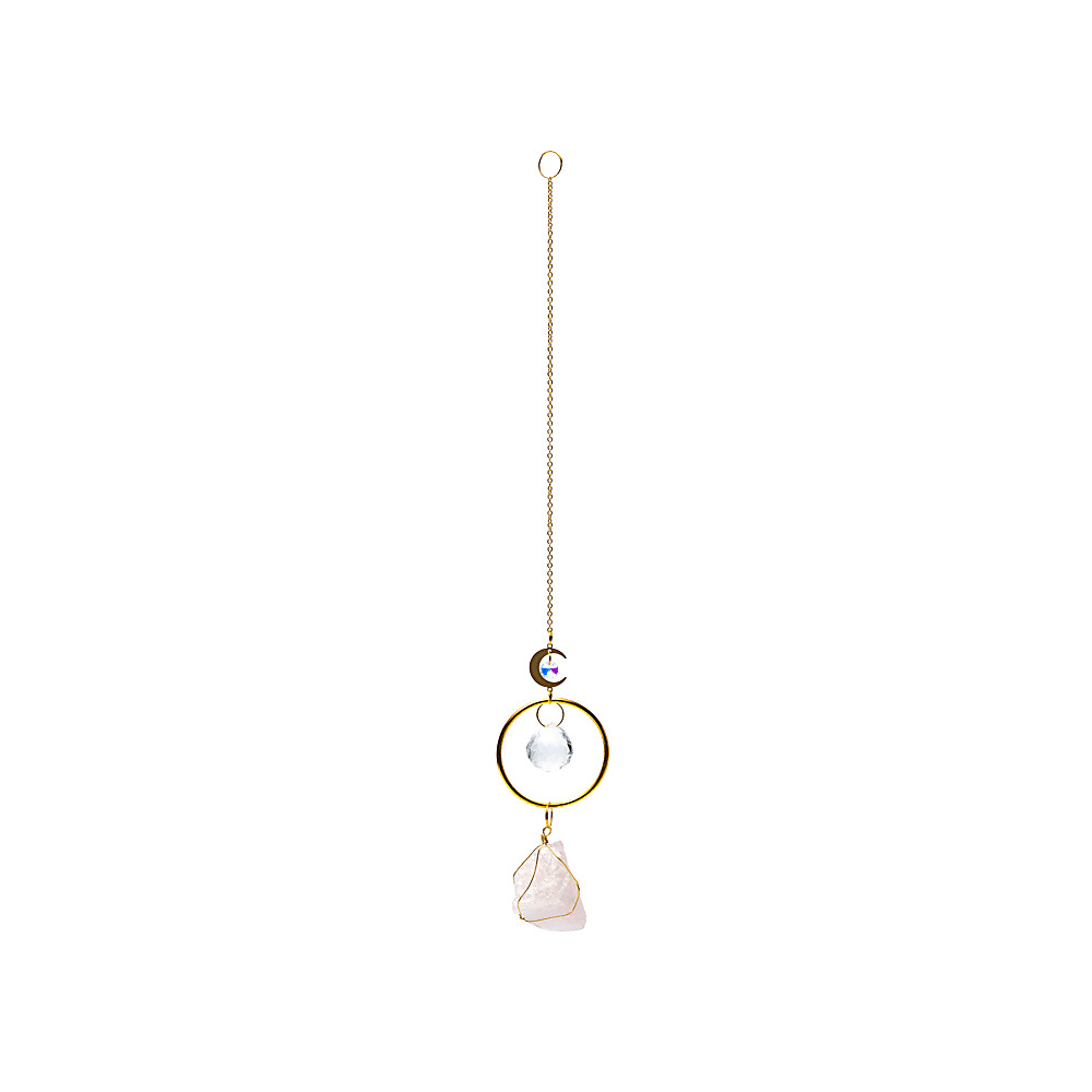 Inspirerad av månens skönhet har denna solfångare mjuk rosenkvarts och glittrande kristalldetaljer. När den placeras i direkt solljus kastar den mjuka regnbågar över ditt rum. Perfekt för att skapa en lugnande och inbjudande atmosfär, oavsett om den hängs vid ett sovrumsfönster, ovanför ett skrivbord eller nära ett växtarrangemang. En idealisk present för älskare av månskensdesign och milda rosa toner.