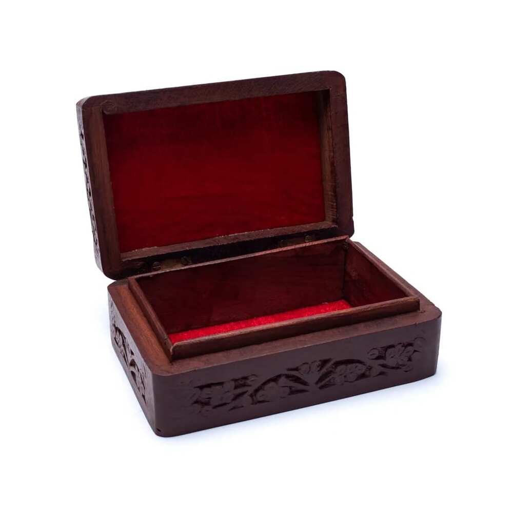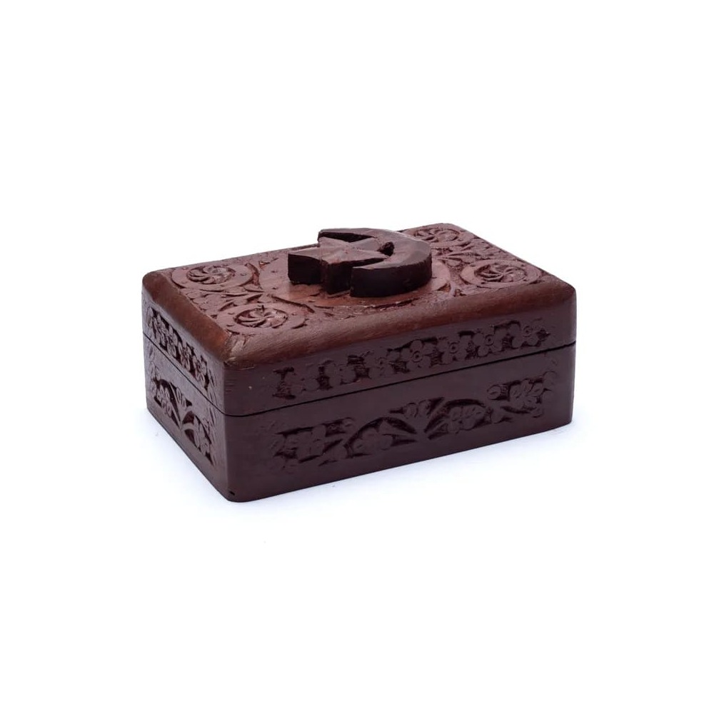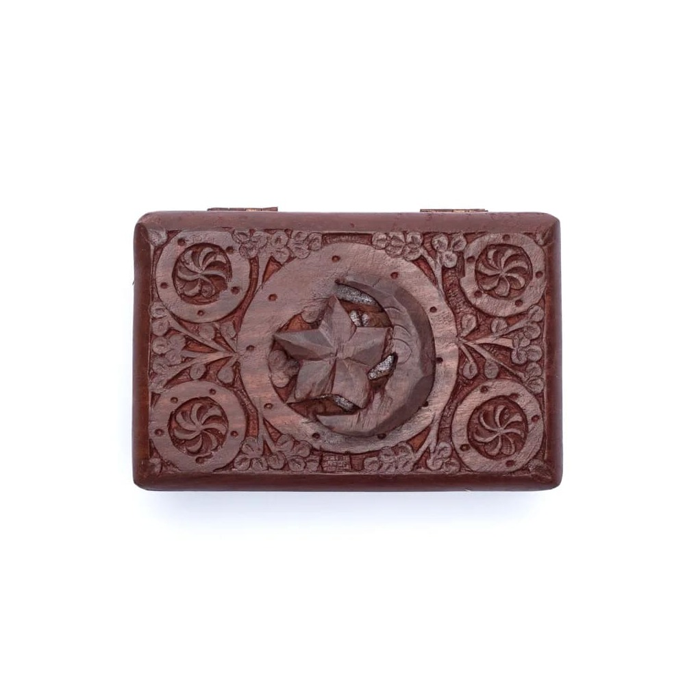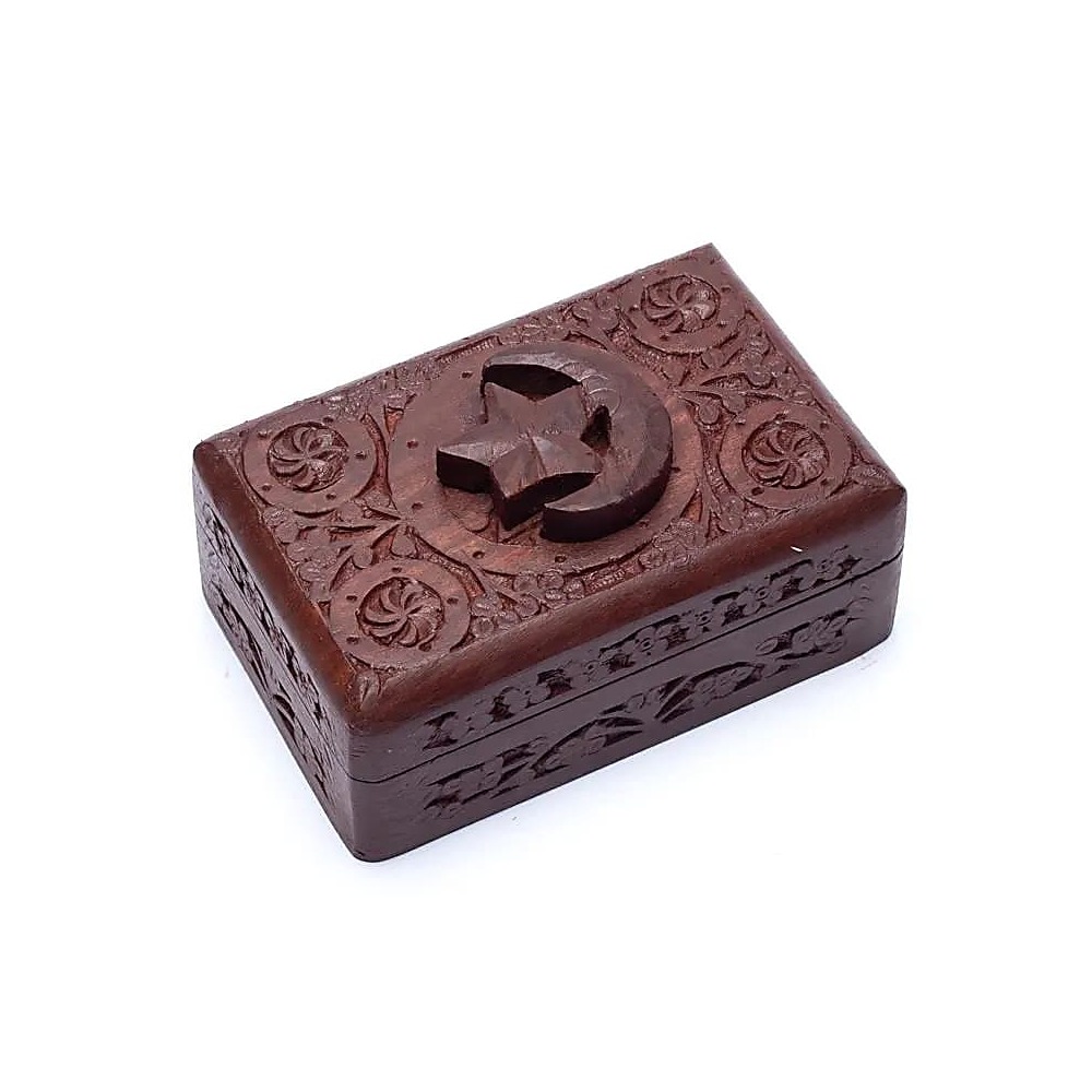 Tarot- eller smyckeskrin i mangoträ med träsnidad stjärna och måne.