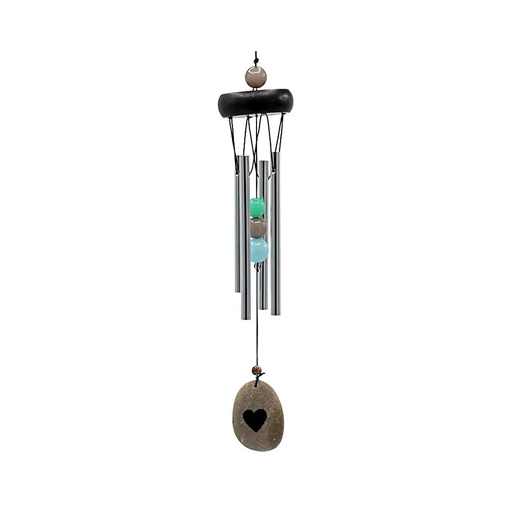 Vindspel med fyra klockor och en stenvindfångare med en hjärtsymbol och tre pärlor som knackare.