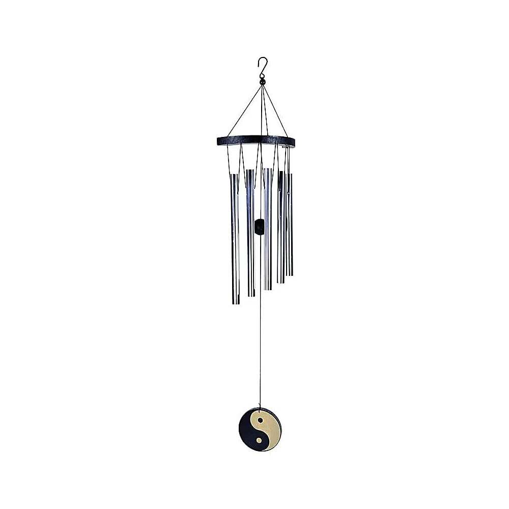 Vindspel med fem klockspel på en svart halvmåneformad träram och en vindfångare i trä med yin yang-symbolen.