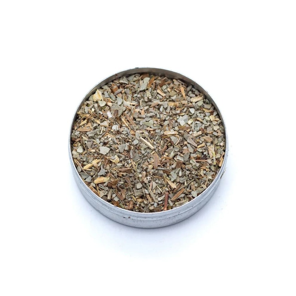 Växtdelar och blad av vit salvia, krossade till ett pulverliknande ämne, 100 % naturligt.