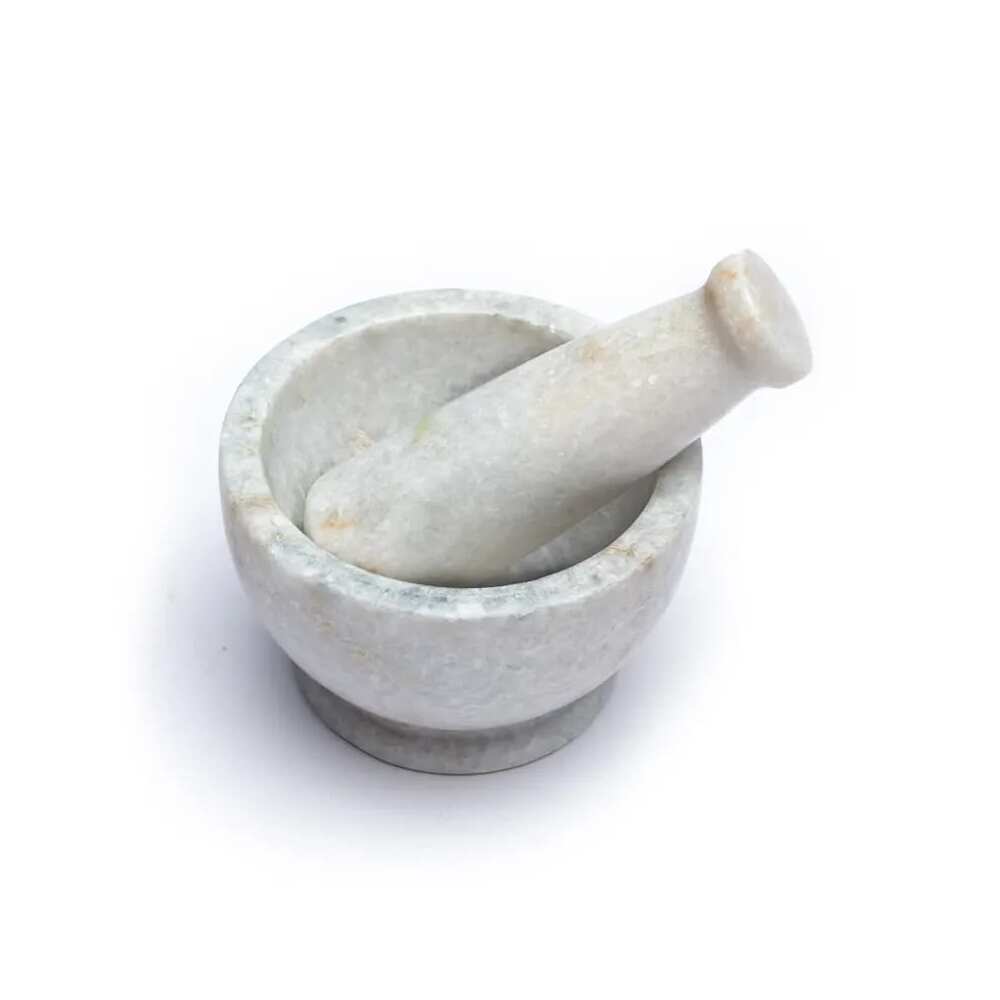Liten mortel och stöt, gjord av vit marmor, för att mala örter och kryddor; även för att göra din egen rökelsepulverblandning av t.ex. vit salvia, rökelsepinnar eller harts.